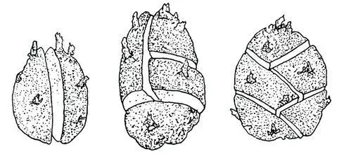 ④150g以上的薯块,从块茎尾部根据芽眼多少,根据马铃薯芽眼的排列切成立体小三角形的若干小薯块,并且每个小三角薯块******要有2个以上健全的芽眼。