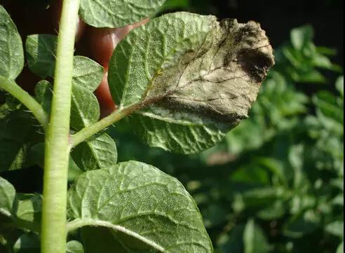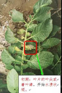 晚疫病可危害叶片、叶柄、茎和块茎。首先发生在叶片的叶尖或着叶缘,开始水渍状褪绿色斑点。(看上去马铃薯叶片像是被烧开的水烫过一样)