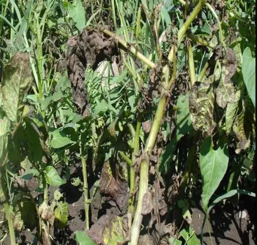 发病严重时,使叶片萎蔫下垂,全株变黑呈湿腐状。天气干旱时,病斑干枯呈褐色,叶片背面无白色霉层,病叶脆易破裂,病害扩展缓慢。