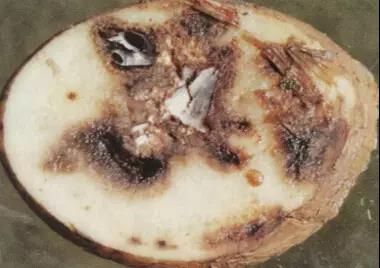 薯块发病时形成淡褐色或紫色不规则病斑,稍微下陷,病斑下面的薯肉呈深度不同的褐色坏死部分。病薯很容易为其他病菌侵染而发生并发症,常常由于******感染而形成软腐病。